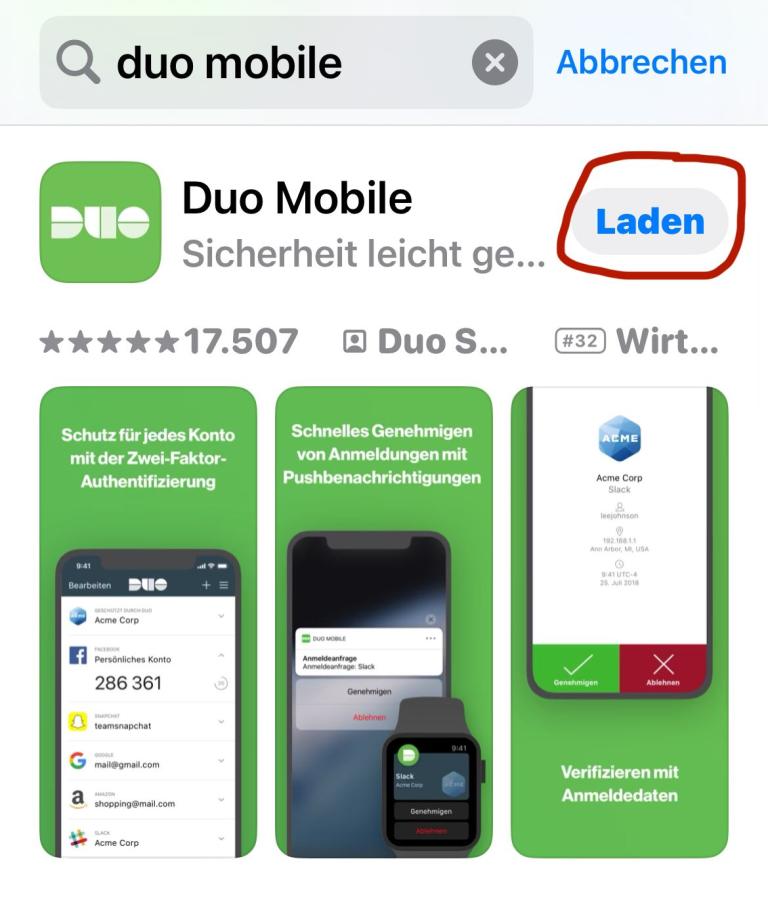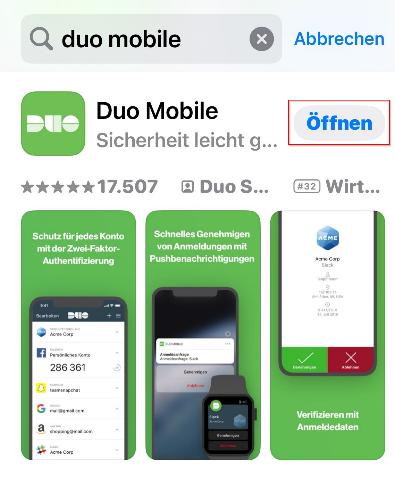 Öffnen Sie den App Store auf Ihrem iPhone und suchen Sie nach Duo Mobile. Achten Sie auf das grüne Symbol und den Herausgeber Duo Security LLC.