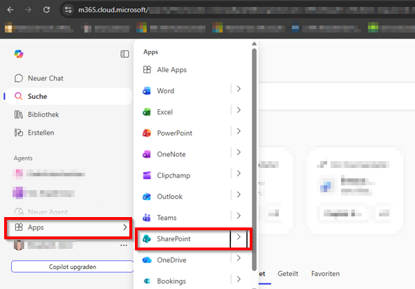 - Linke Spalte "Apps" anklicken und Sharepoint heraussuchen - anklicken.