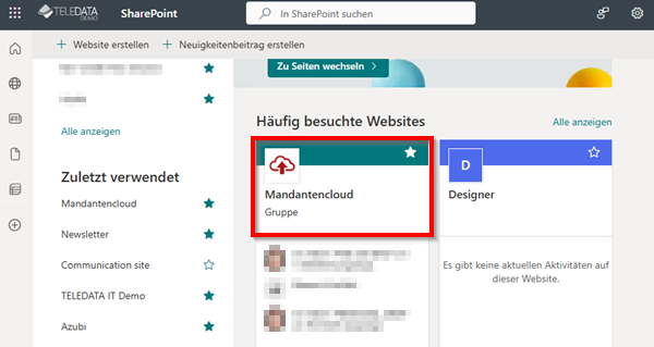 - Die gewünschte Site anklicken (z.B. Mandantencloud). Falls diese nicht zu sehen ist, den Namen bei "In Sharepoint suchen" eingeben.