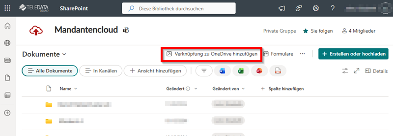 - Jetzt befinden Sie sich in der "Dokumentenbibliothek. Klicken Sie auf "Verknüpfung zu OneDrive hinzufügen".