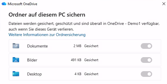 - Weiter anklicken - bei der Abfrage "Ordner auf diesem PC sichern" alle Ordner ausschalten, damit ASP-Daten nicht in die Microsoft-Cloud und auf andere Rechner wandern und außerdem die Datenablage in Ihrem Profil nicht zu groß wird. Weiter anklicken.